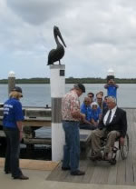 A recent unveiling on 24th September of Frank Miles life-size bronze pelican "Steptoe", (pictured left) commissioned by the Ballina Shire Council, at the Fawcett Park Wharf. This wharf was renamed on the day to the "Lance Ferris Wharf" in honour of the late Lance Ferris the towns' famed 'Pelican Man'. This was a very exciting moment for Frank as well the Australian Seabird Rescue Service and Lance's family members.